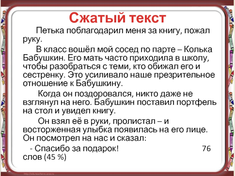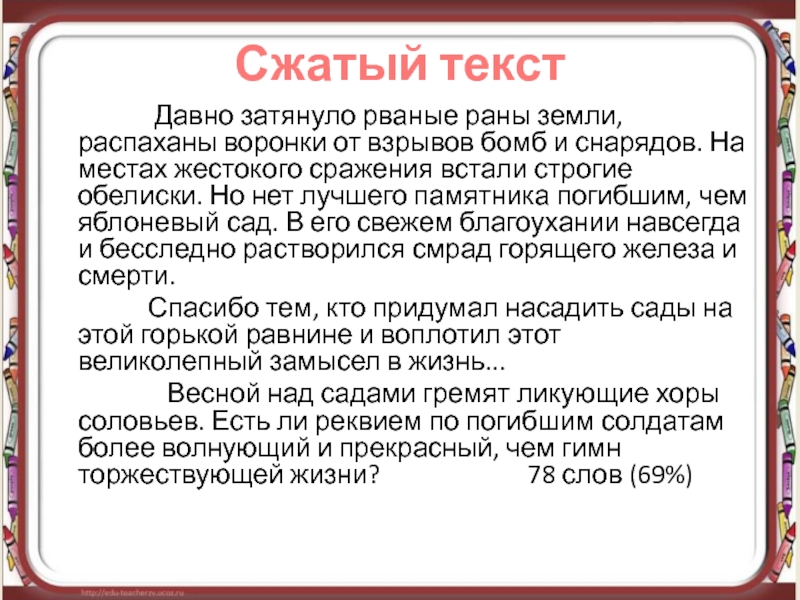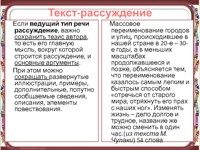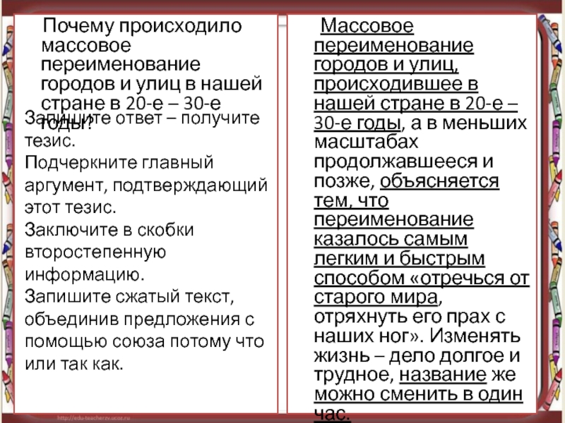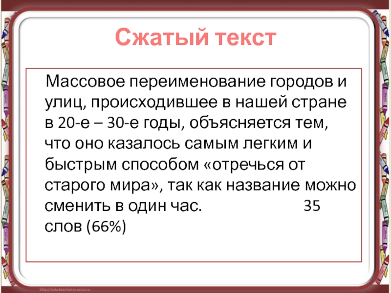 Массовое переименование городов и улиц, происходившее в нашей стране в 20-е – 30-е годы, а в меньших масштабах продолжавшееся и позже, объясняется тем, что переименование казалось самым легким и быстрым способом «отречься от старого мира, отряхнуть его прах с наших ног». Изменять жизнь – дело долгое и трудное, название же можно сменить в один час. (из текста М. Чулаки) 54 слова
