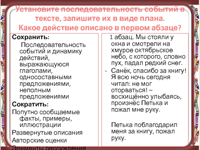 Последовательность событий и динамику действий, выражающуюся глаголами, односоставными предложениями, неполным предложениями