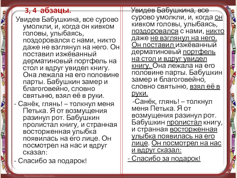 Увидев Бабушкина, все сурово умолкли, и, когда он кивком головы, улыбаясь, поздоровался с нами, никто даже не взглянул на него. Он поставил изжёванный дерматиновый портфель на стол и вдруг увидел книгу. Она лежала на его половине парты. Бабушкин замер и благоговейно, словно святыню, взял её в руки.