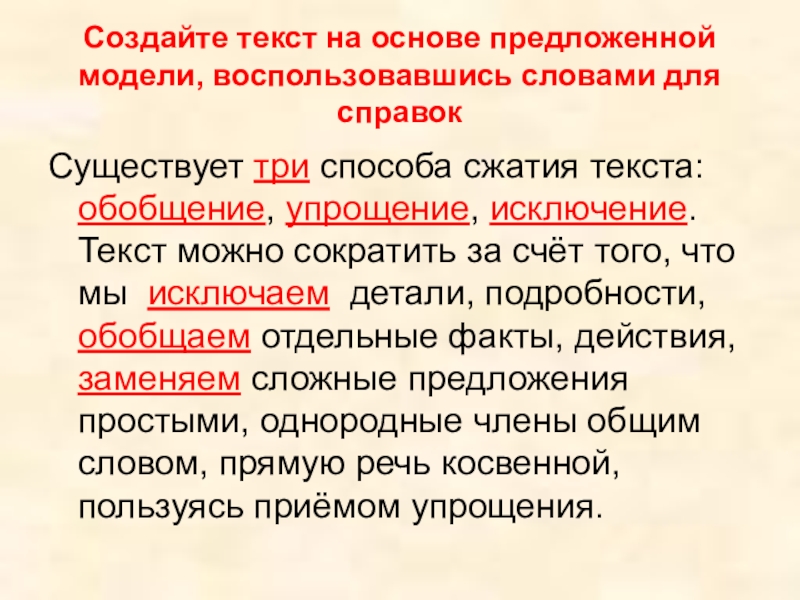 способа сжатия текста: обобщение, упрощение, исключение. Текст можно сократить за счёт того, что мы исключаем детали, подробности, обобщаем отдельные факты, действия, заменяем сложные предложения простыми, однородные члены общим словом, прямую речь косвенной, пользуясь приёмом упрощения.