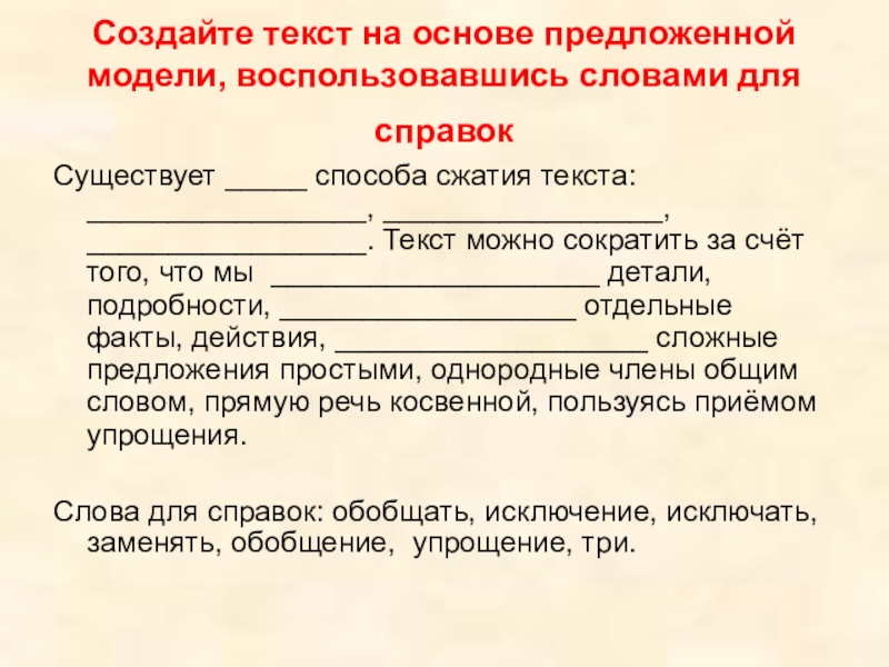 _____ способа сжатия текста: _________________, _________________, _________________. Текст можно сократить за счёт того, что мы ____________________ детали, подробности, __________________ отдельные факты, действия, ___________________ сложные предложения простыми, однородные члены общим словом, прямую речь косвенной, пользуясь приёмом упрощения.