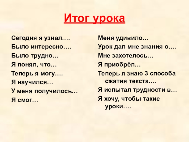 - создать итоговый сжатый текст, используя полученные на уроке знания.