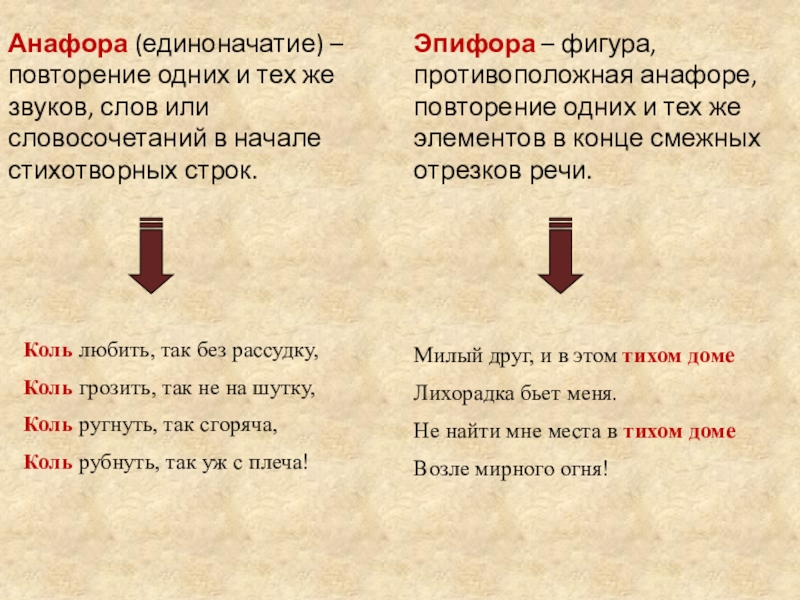 Эпифора – фигура, противоположная анафоре, повторение одних и тех же элементов в конце смежных отрезков речи.
