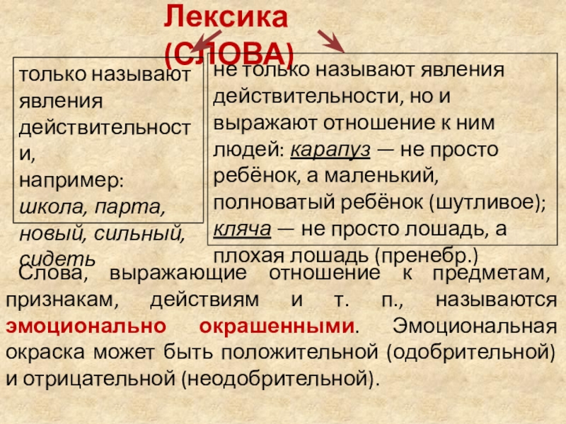 Слова, выражающие отношение к предметам, признакам, действиям и т. п., называются эмоционально окрашенными. Эмоциональная окраска может быть положительной (одобрительной) и отрицательной (неодобрительной).