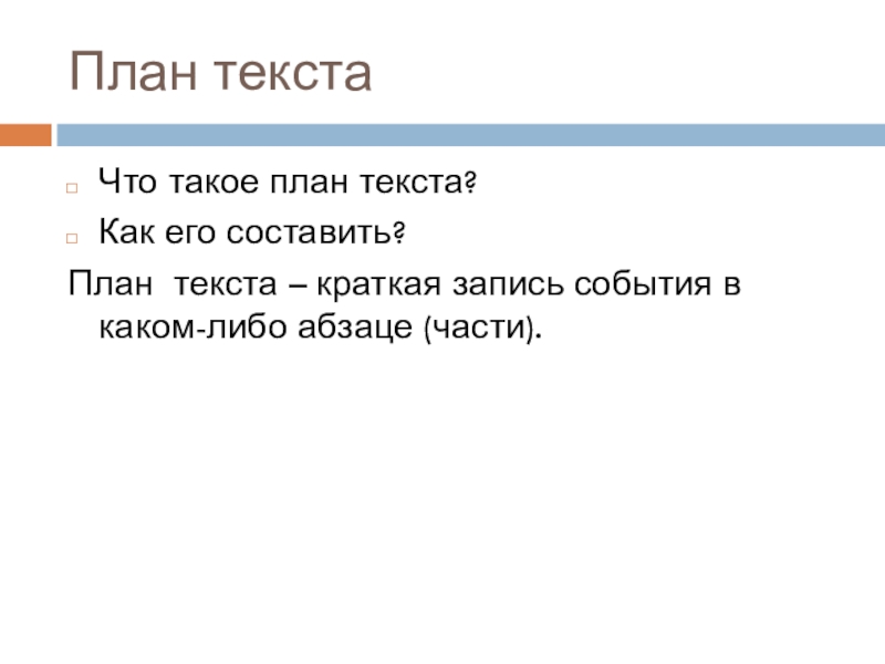 План текстаЧто такое план текста?Как его составить?План текста – краткая запись события в каком-либо абзаце (части).