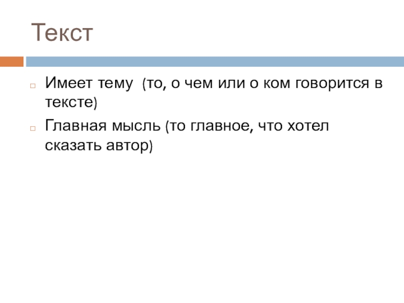 Текст Имеет тему (то, о чем или о ком говорится в тексте)Главная мысль (то главное, что хотел