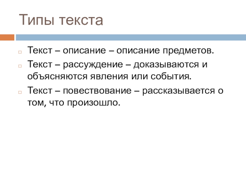 Типы текстаТекст – описание – описание предметов. Текст – рассуждение – доказываются и объясняются явления или события.Текст