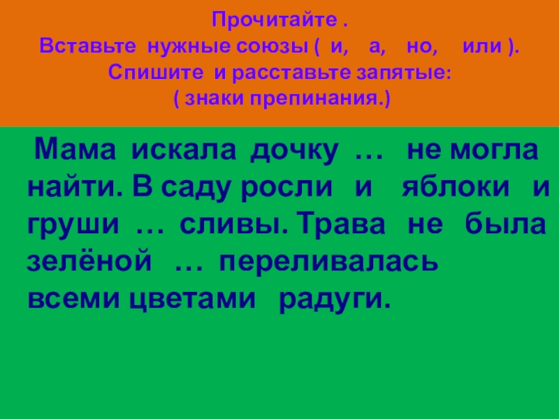Мама искала дочку … не могла найти. В саду росли и яблоки и груши … сливы. Трава не была зелёной … переливалась всеми цветами радуги.