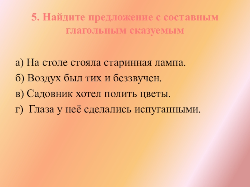 5. Найдите предложение с составным глагольным сказуемыма) На столе стояла старинная лампа.б) Воздух был тих и беззвучен.в)