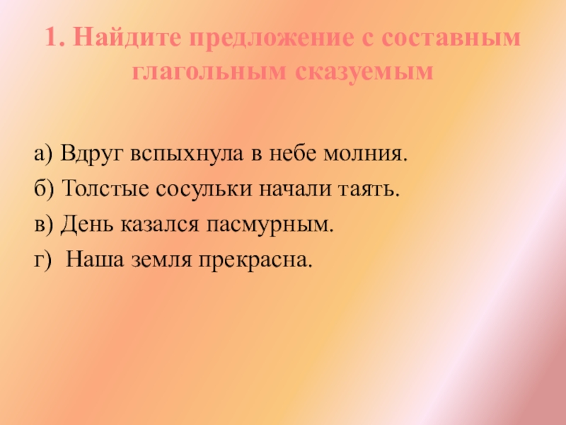 1. Найдите предложение с составным глагольным сказуемыма) Вдруг вспыхнула в небе молния.б) Толстые сосульки начали таять.в) День
