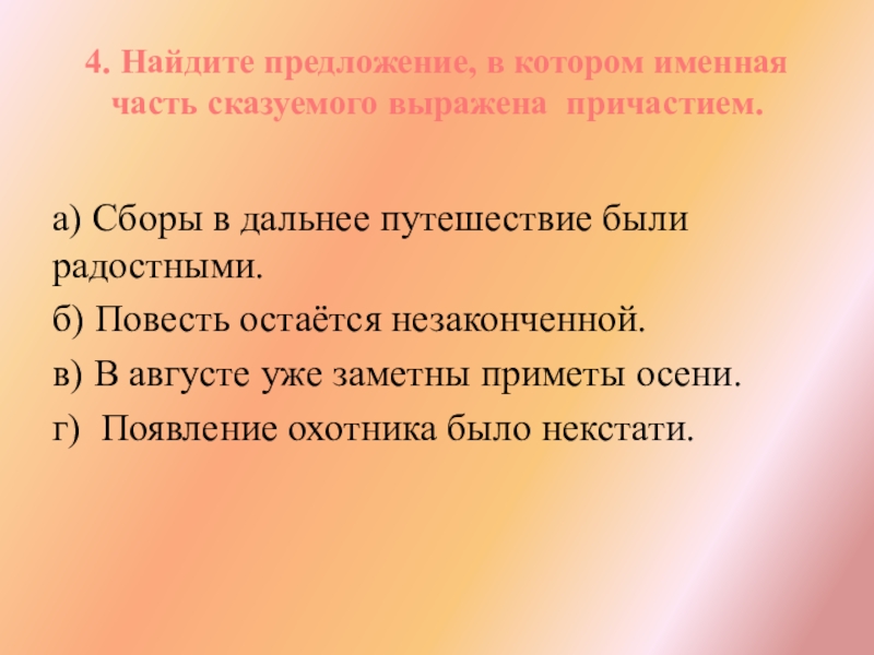 4. Найдите предложение, в котором именная часть сказуемого выражена причастием.а) Сборы в дальнее путешествие были радостными.б) Повесть