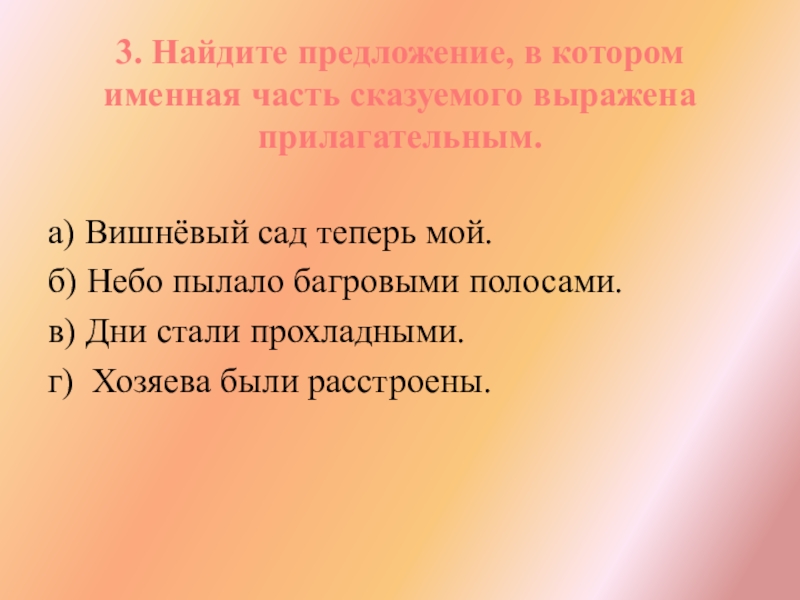 3. Найдите предложение, в котором именная часть сказуемого выражена прилагательным.а) Вишнёвый сад теперь мой.б) Небо пылало багровыми
