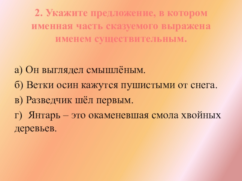 2. Укажите предложение, в котором именная часть сказуемого выражена именем существительным.а) Он выглядел смышлёным.б) Ветки осин кажутся