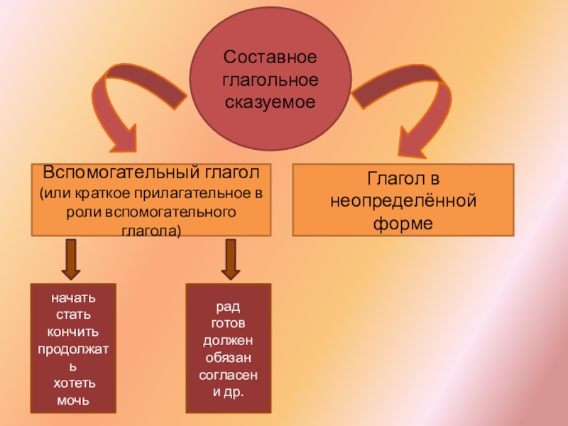 начатьстатькончитьпродолжать хотеть мочь рад готов должен обязан согласен и др.