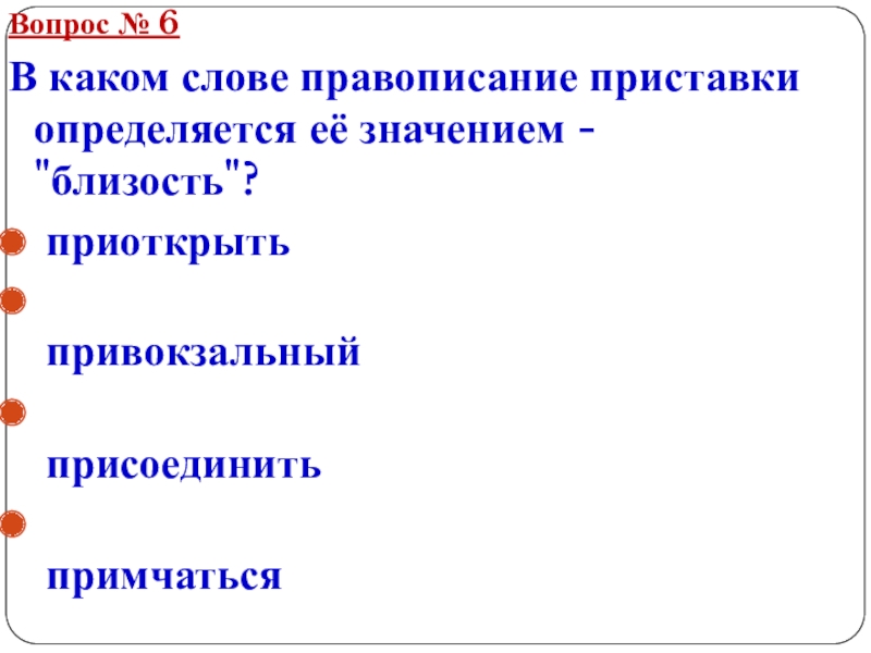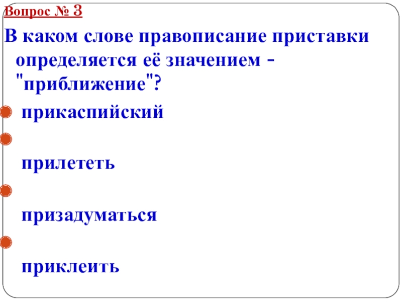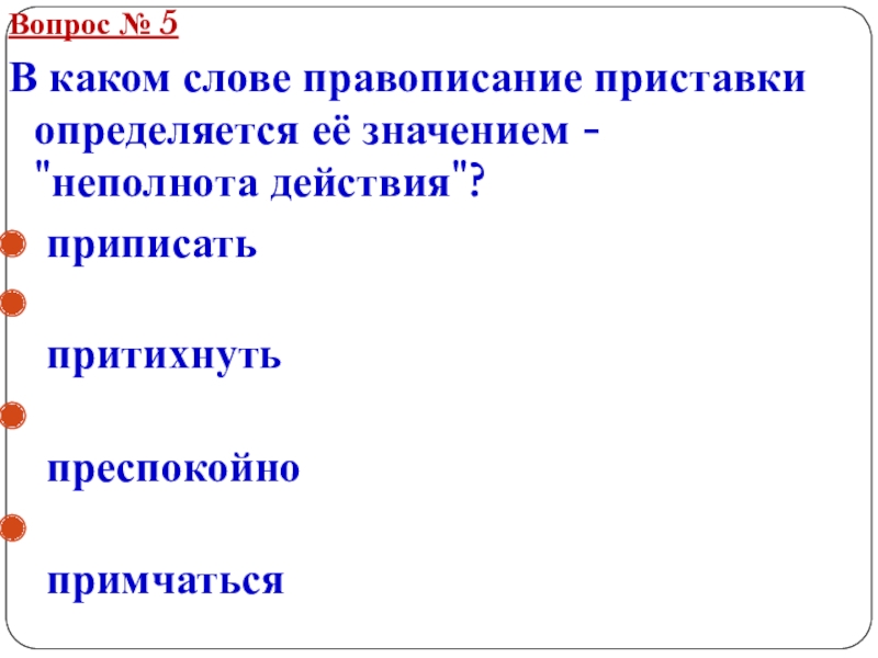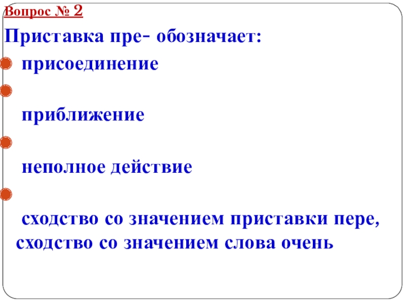 Вопрос № 2 Приставка пре- обозначает: присоединение  приближение   неполное действие  сходство со значением приставки пере, сходство со значением слова