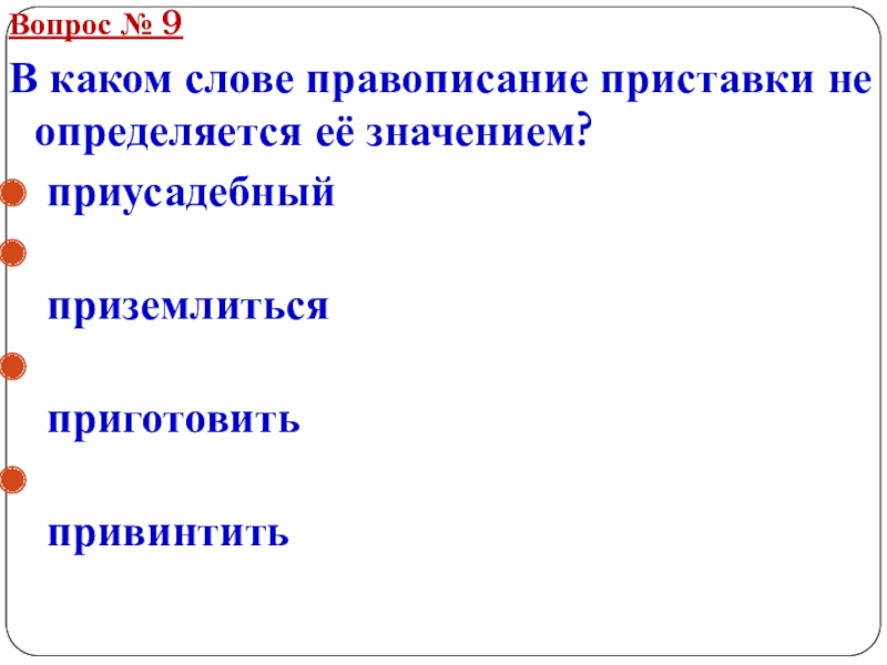 Вопрос № 9 В каком слове правописание приставки не определяется её значением? приусадебный  приземлиться  приготовить  привинтить