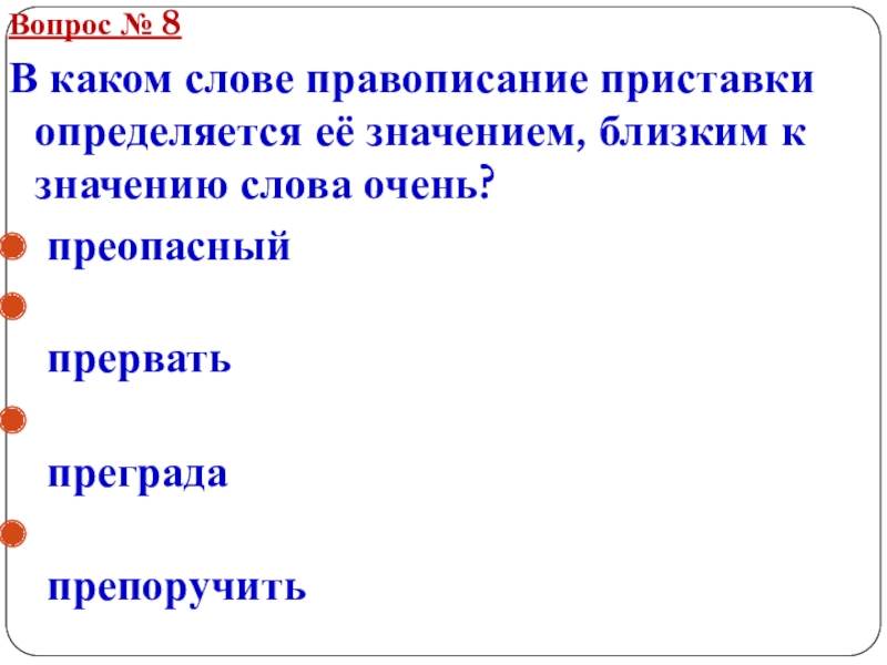 Вопрос № 8 В каком слове правописание приставки определяется её значением, близким к значению слова очень? преопасный  прервать  преграда