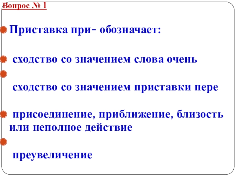 Вопрос № 1 Приставка при- обозначает: сходство со значением слова очень  сходство со значением приставки пере  присоединение, приближение, близость или неполное действие  преувеличение