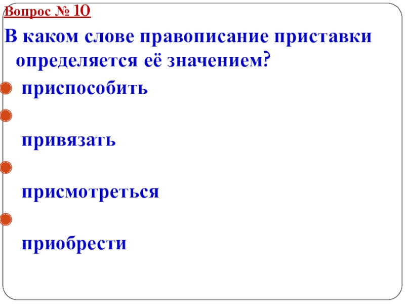 Вопрос № 10 В каком слове правописание приставки определяется её значением? приспособить  привязать  присмотреться  приобрести