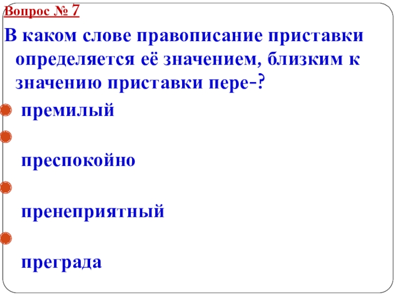 Вопрос № 7 В каком слове правописание приставки определяется её значением, близким к значению приставки пере-? премилый  преспокойно  пренеприятный
