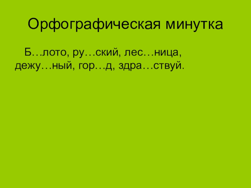 Орфографическая минутка Б…лото, ру…ский, лес…ница, дежу…ный, гор…д, здра…ствуй.