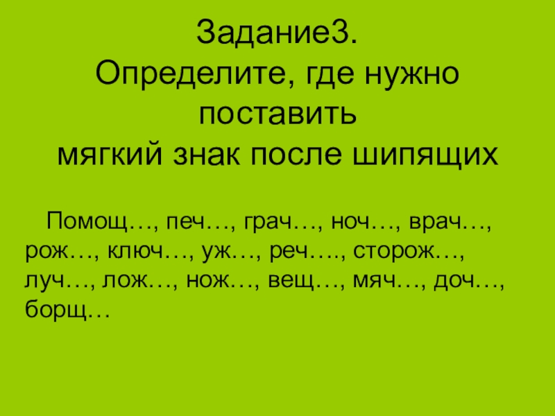 Задание3. Определите, где нужно поставить  мягкий знак после шипящих   Помощ…, печ…,