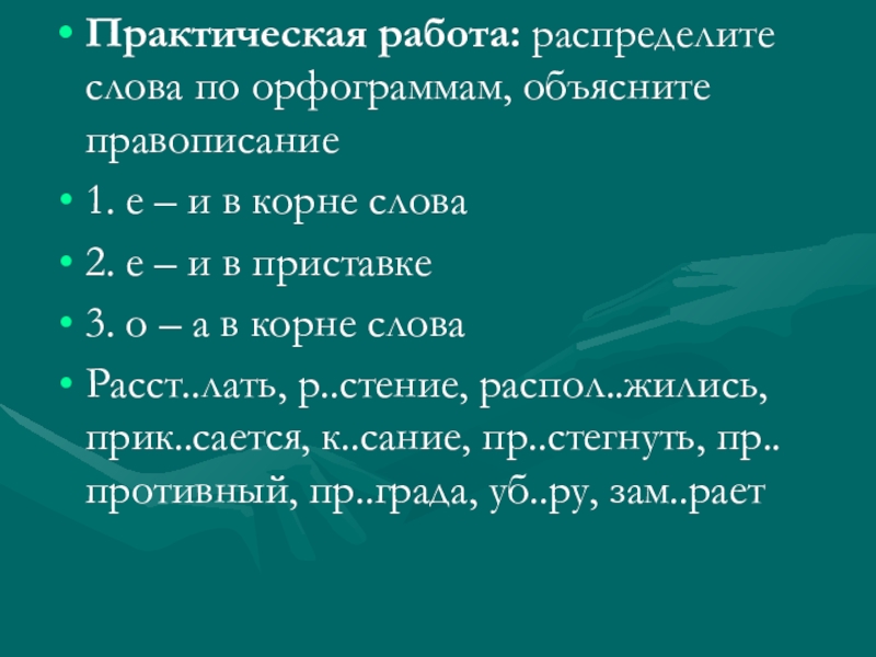 Практическая работа: распределите слова по орфограммам, объясните правописание