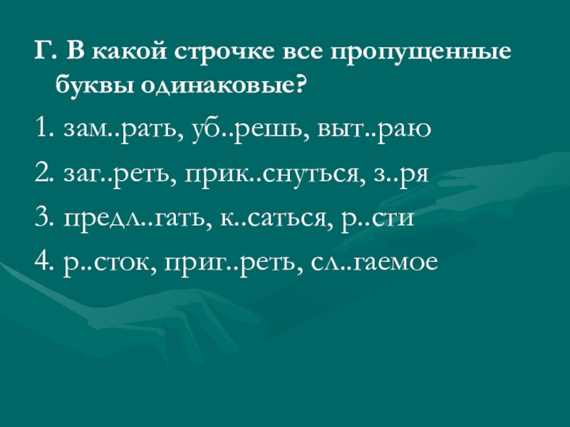 Г. В какой строчке все пропущенные буквы одинаковые?