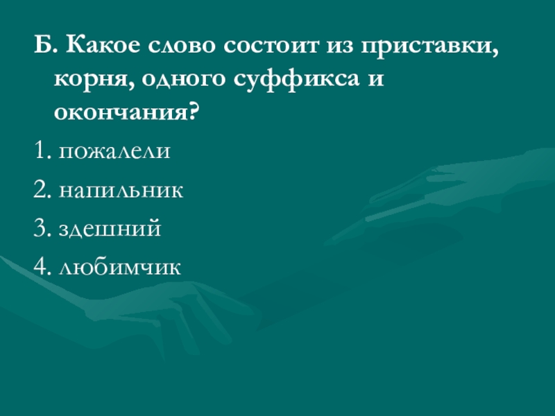 Б. Какое слово состоит из приставки, корня, одного суффикса и окончания?