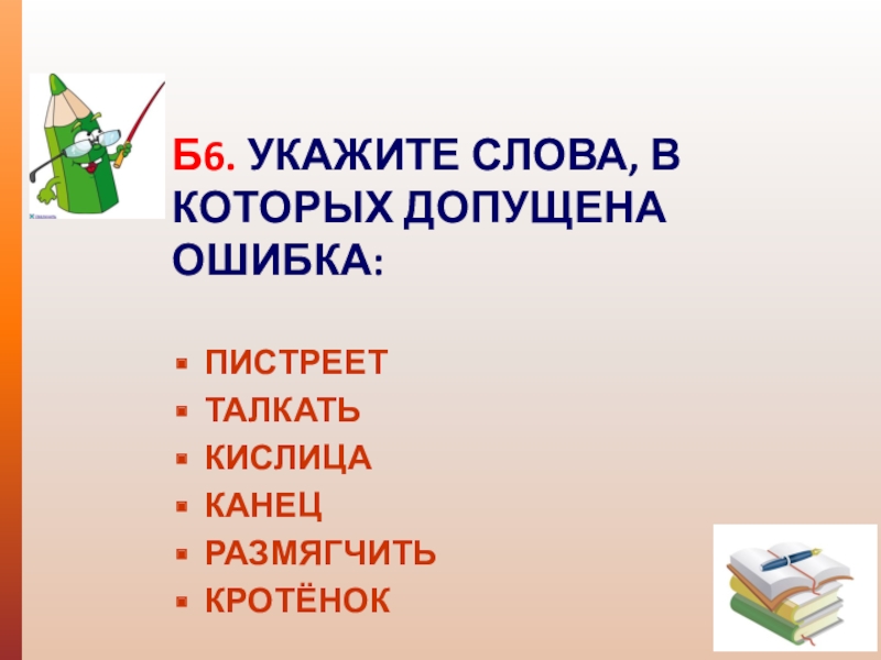 Б6. УКАЖИТЕ СЛОВА, В КОТОРЫХ ДОПУЩЕНА ОШИБКА: