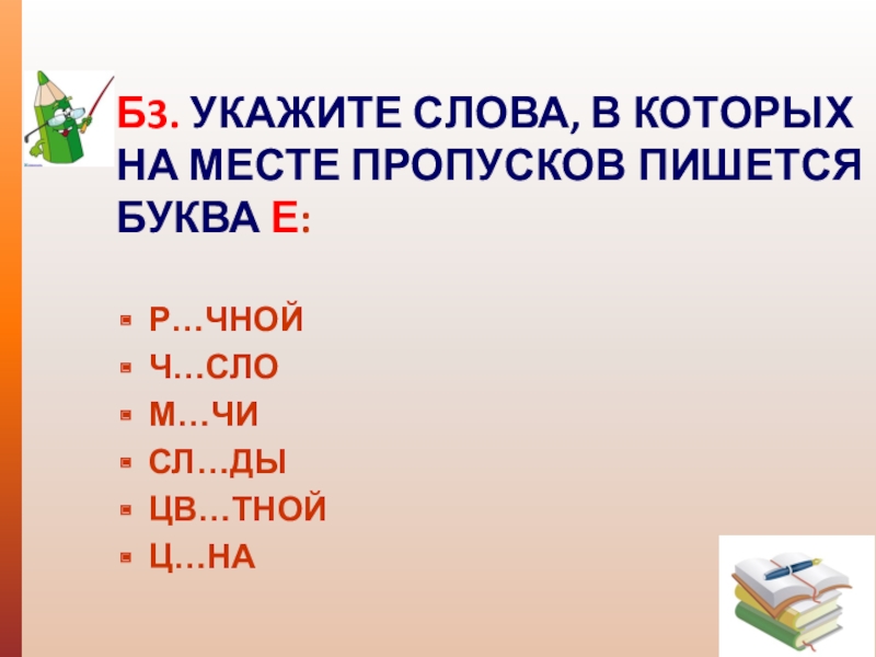 Б3. УКАЖИТЕ СЛОВА, В КОТОРЫХ НА МЕСТЕ ПРОПУСКОВ ПИШЕТСЯ БУКВА Е: