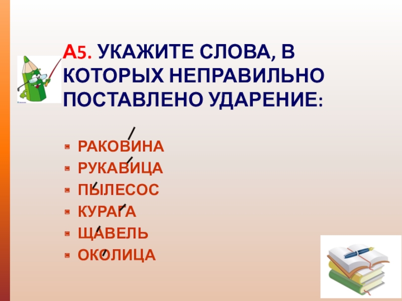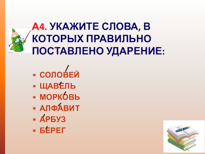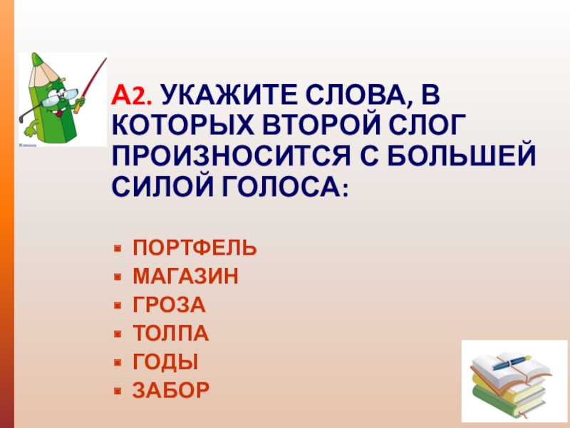А2. УКАЖИТЕ СЛОВА, В КОТОРЫХ ВТОРОЙ СЛОГ ПРОИЗНОСИТСЯ С БОЛЬШЕЙ СИЛОЙ