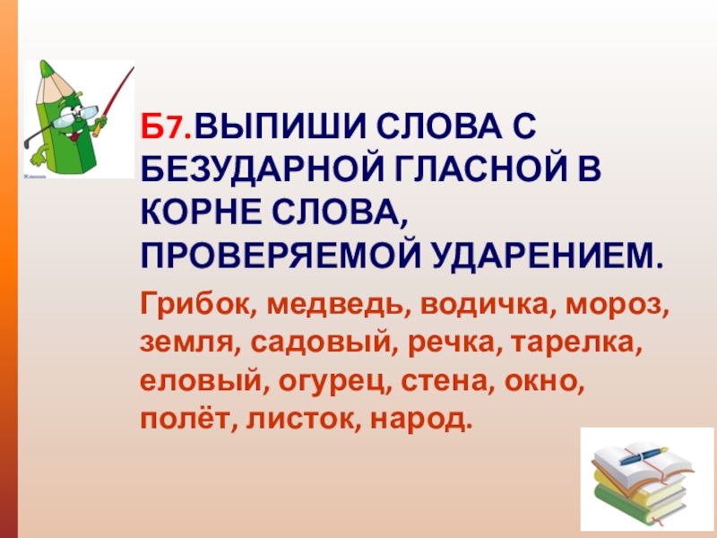 Б7.ВЫПИШИ СЛОВА С БЕЗУДАРНОЙ ГЛАСНОЙ В КОРНЕ СЛОВА, ПРОВЕРЯЕМОЙ УДАРЕНИЕМ.