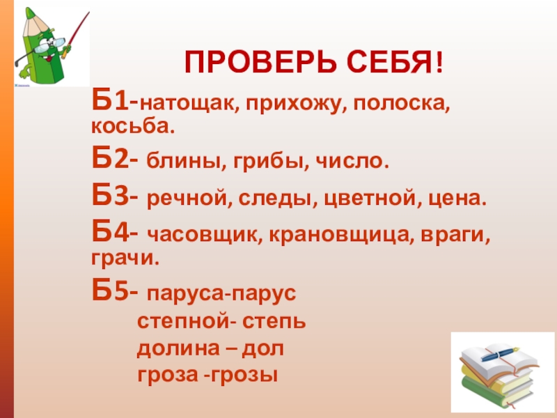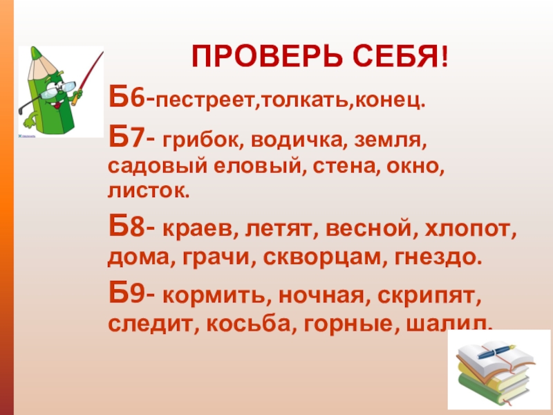Б9- кормить, ночная, скрипят, следит, косьба, горные, шалил.