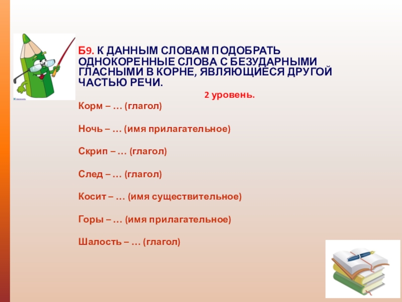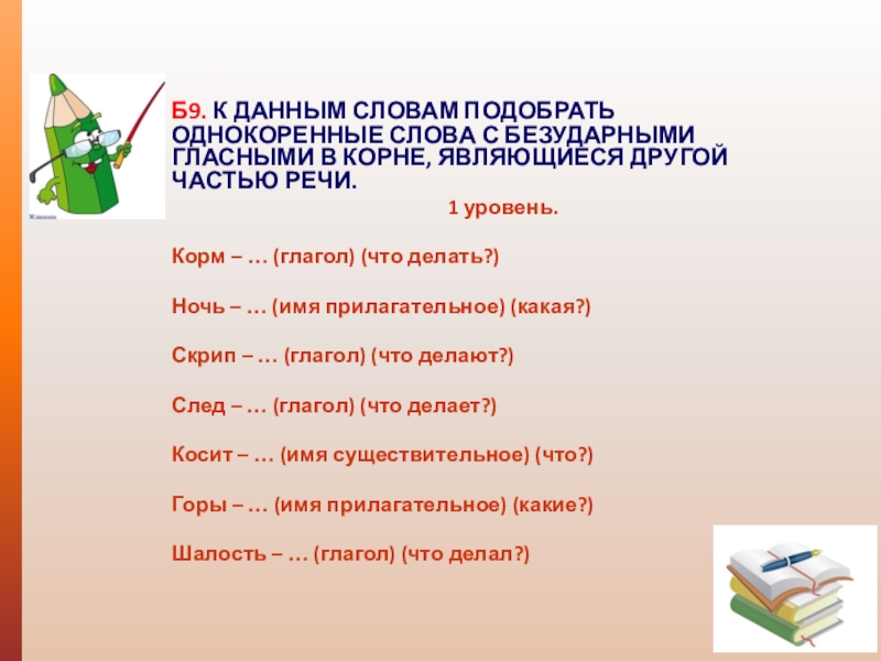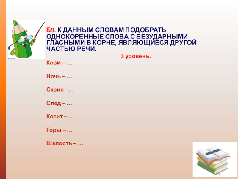Б9. К ДАННЫМ СЛОВАМ ПОДОБРАТЬ ОДНОКОРЕННЫЕ СЛОВА С БЕЗУДАРНЫМИ ГЛАСНЫМИ В