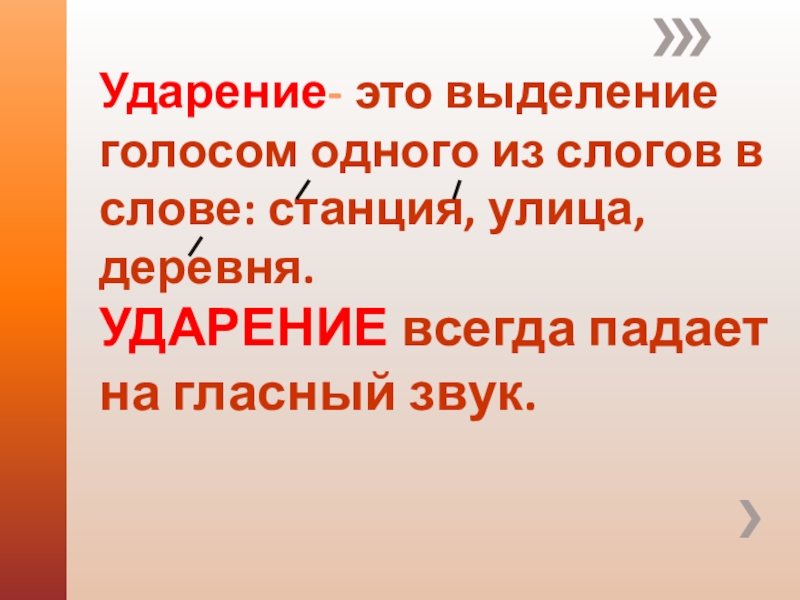 Слайд 3Ударение- это выделение голосом одного из слогов в слове: станция, улица,