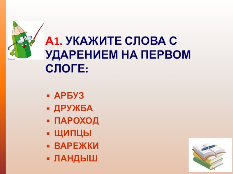 А1. УКАЖИТЕ СЛОВА С УДАРЕНИЕМ НА ПЕРВОМ СЛОГЕ: