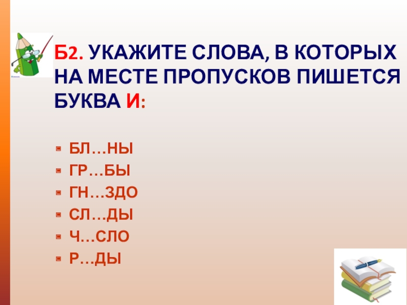 Б2. УКАЖИТЕ СЛОВА, В КОТОРЫХ НА МЕСТЕ ПРОПУСКОВ ПИШЕТСЯ БУКВА И: