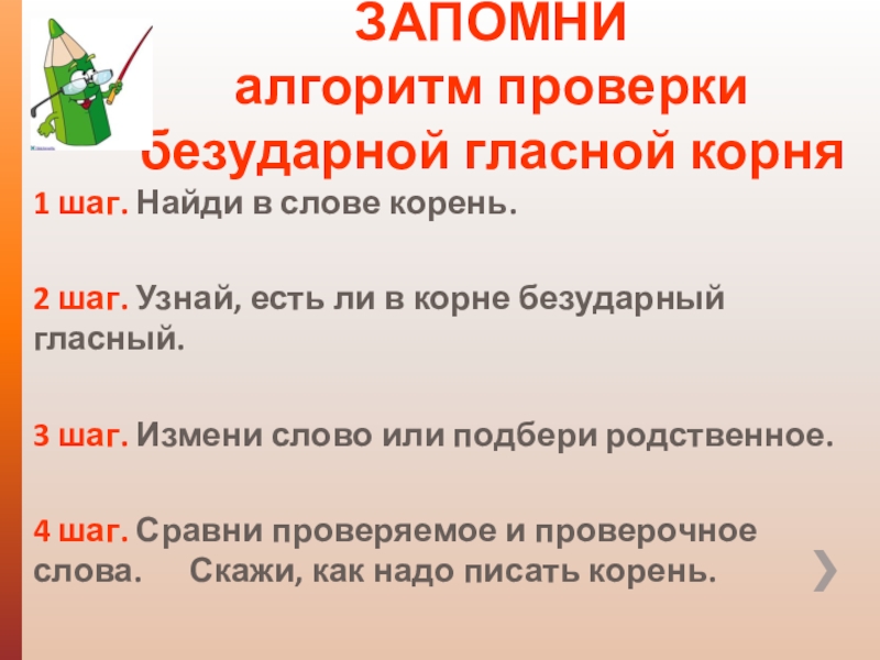 4 шаг. Сравни проверяемое и проверочное слова. Скажи, как надо писать корень.