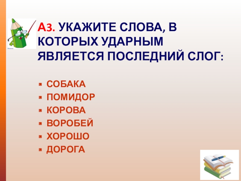 А3. УКАЖИТЕ СЛОВА, В КОТОРЫХ УДАРНЫМ ЯВЛЯЕТСЯ ПОСЛЕДНИЙ СЛОГ:
