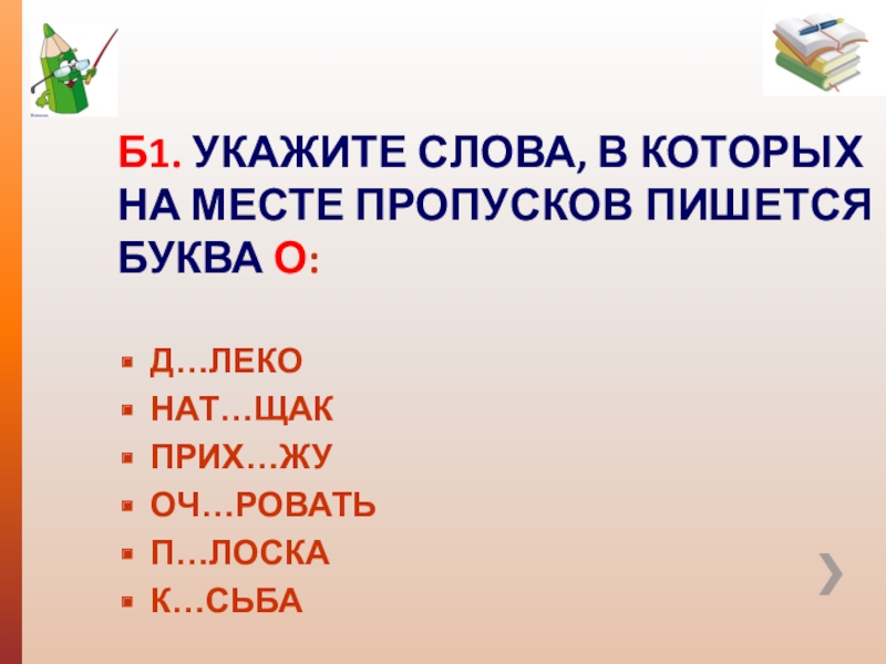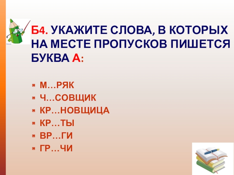 Б4. УКАЖИТЕ СЛОВА, В КОТОРЫХ НА МЕСТЕ ПРОПУСКОВ ПИШЕТСЯ БУКВА А: