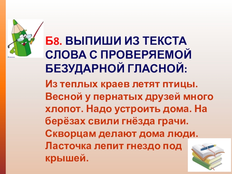 Б8. ВЫПИШИ ИЗ ТЕКСТА СЛОВА С ПРОВЕРЯЕМОЙ БЕЗУДАРНОЙ ГЛАСНОЙ: