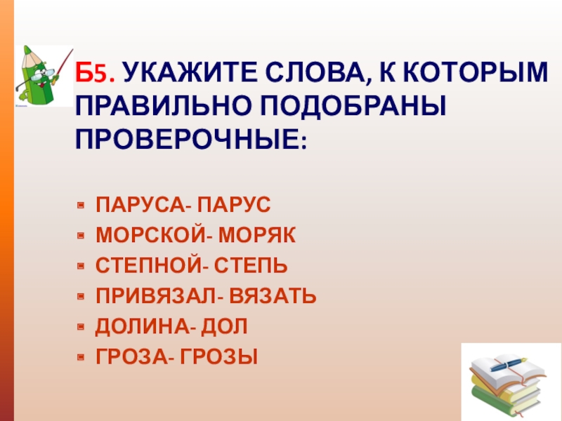 Б5. УКАЖИТЕ СЛОВА, К КОТОРЫМ ПРАВИЛЬНО ПОДОБРАНЫ ПРОВЕРОЧНЫЕ: