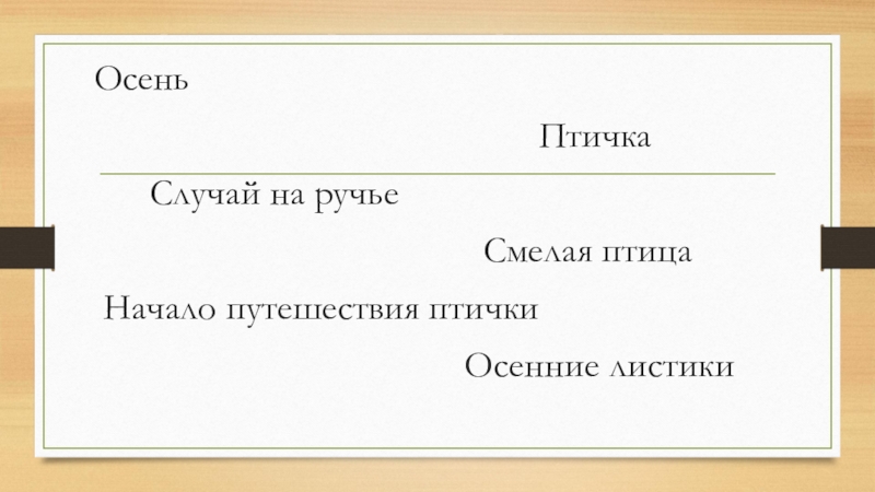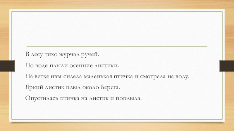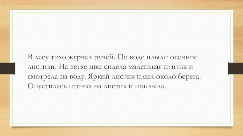В лесу тихо журчал ручей. По воде плыли осенние листики. На ветке ивы сидела маленькая птичка и смотрела на воду. Яркий листик плыл около берега. Опустилась птичка на листик и поплыла.