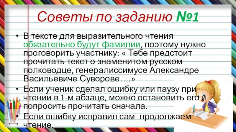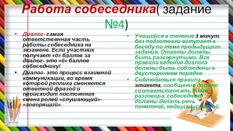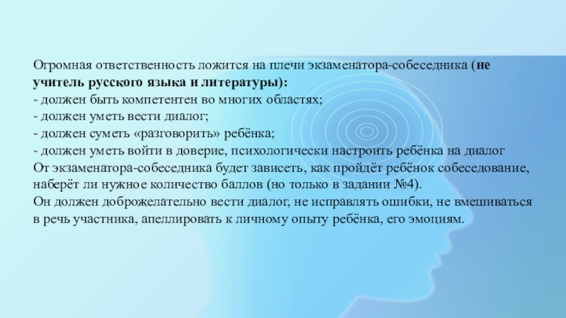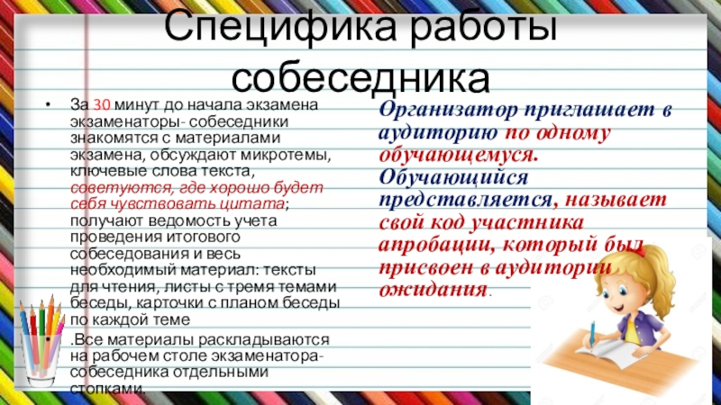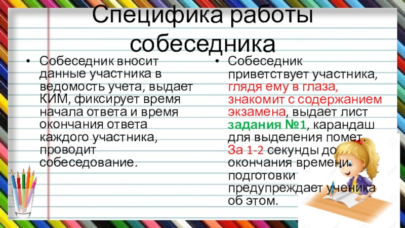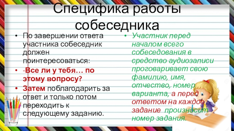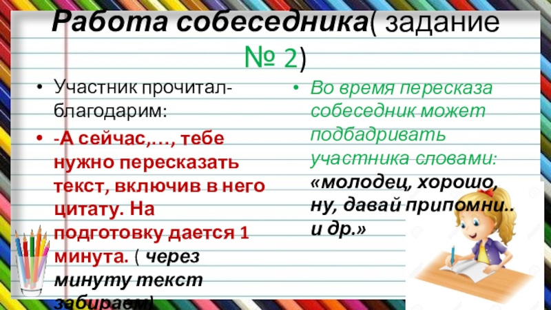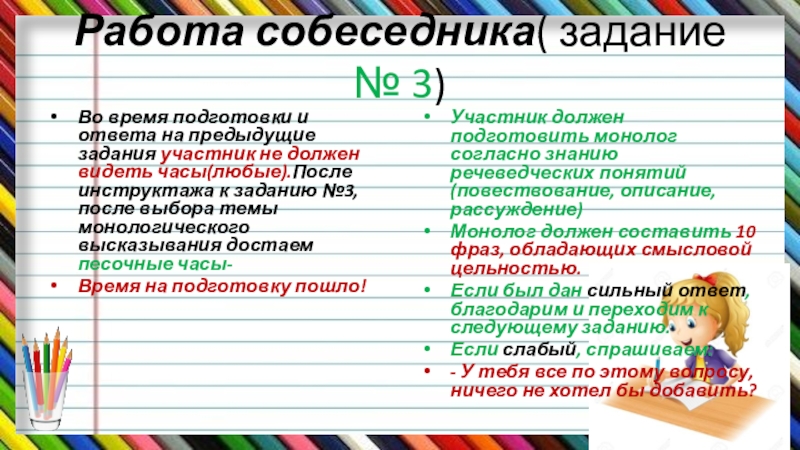 Собеседник приветствует участника, глядя ему в глаза, знакомит с содержанием экзамена, выдает лист задания №1, карандаш для выделения помет. За 1-2 секунды до окончания времени подготовки предупреждает ученика об этом.