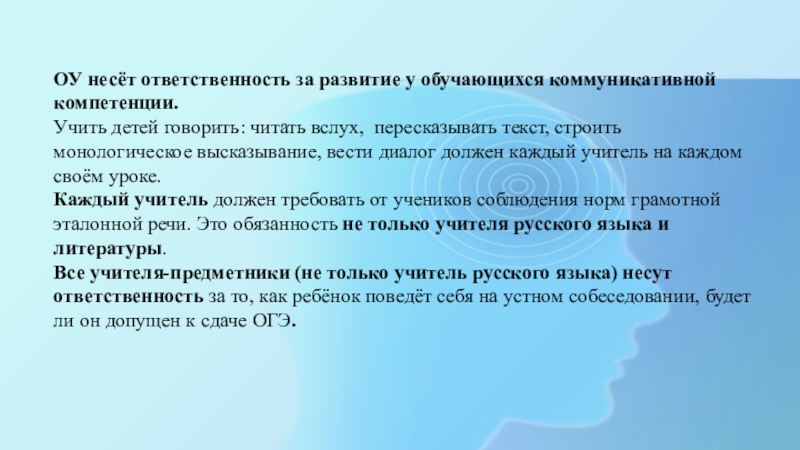 Участник должен подготовить монолог согласно знанию речеведческих понятий (повествование, описание, рассуждение)