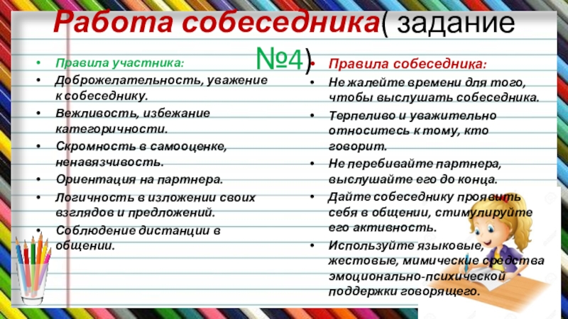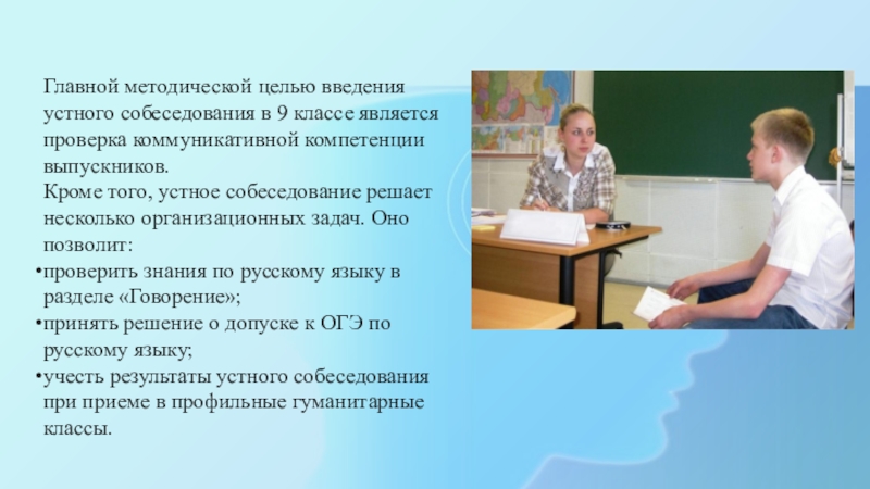Учащийся в течение 3 минут, без подготовки вступает в беседу по теме предыдущего задания. Ответы должны быть развернутыми. Все правила ведения диалога должны быть соблюдены в двустороннем порядке: