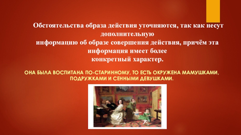 ОНА БЫЛА ВОСПИТАНА ПО-СТАРИННОМУ, ТО ЕСТЬ ОКРУЖЕНА МАМУШКАМИ, ПОДРУЖКАМИ И СЕННЫМИ ДЕВУШКАМИ.