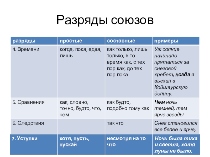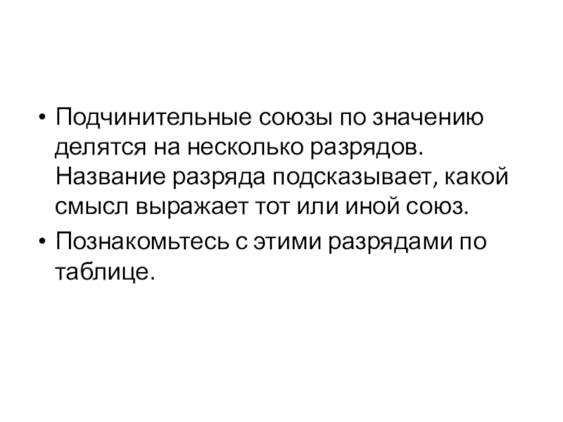 Слайд 2Подчинительные союзы по значению делятся на несколько разрядов. Название разряда подсказывает,