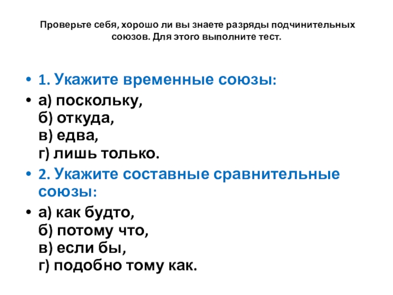 Слайд 11 Проверьте себя, хорошо ли вы знаете разряды подчинительных союзов. Для